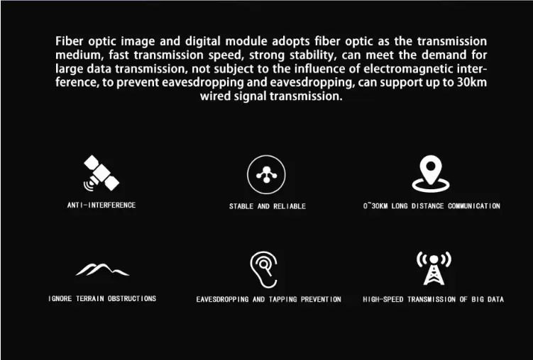 Este sistema profissional de transmissão óptica integrado a drones (com bobina de fibra óptica) suporta alcances flexíveis (3 km a 40 km). Com alta confiabilidade e design compacto, garante transmissão de dados estável para operações de médio e curto alcance, atendendo às rigorosas demandas de anti-interferência e largura de banda de missões industriais.