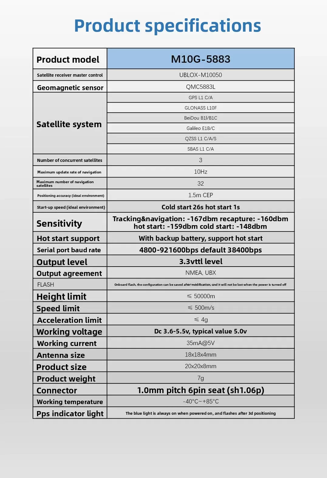 O módulo GNSS M10G-5883 adota o chip M10 de última geração da Ublox, que oferece alto desempenho e velocidade de busca de satélites mais rápida. Ele pode utilizar até 32 satélites e possui posicionamento preciso. O sensor de bússola geomagnética de alto desempenho QMC5883L integrado tem apenas 20 x 20 x 8 mm, sendo compacto e fácil de instalar. Adota uma antena importada de alto desempenho e pequeno volume, com design compacto e sem perda de desempenho. Pesa apenas 7 g, sendo ideal para pequenos drones/veículos de órbita/asas fixas leves.